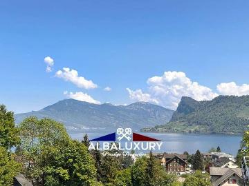 Diese helle Penthouse-Wohnung mit Panoramablick auf den Vierwaldstättersee und den Pilatus befindet sich in der Wohnanlage Unter Steinhof in Hergiswil. Das Gebäude, das im Jahr 2001 erbaut und im Jahr 2015 von einem Bürogebäude in ein Wohngebäude umgewandelt wurde, beherbergt sechs Wohnungen und Büros im Erdgeschoss. Die Wohnung besticht durch helle, moderne und gut ausgestattete Räume, ideal für diejenigen, die in einer ruhigen Umgebung, aber in der Nähe von Luzern leben möchten. Hauptdaten: Wohnfläche: 102 m² Terrasse & Wintergarten: 90,3 m² Zimmer: 3,5 (Wohnzimmer + 2 Schlafzimmer) Badezimmer: 2 Keller: 12 m² Parkplatz in der Tiefgarage: 1 Technikraum/privater Waschraum (Réduit) mit Waschtrockner-Säule ✨ Ausstattung und Ausführung Dunkle Keramikfliesenböden in der gesamten Wohnung Hochwertige Küche mit Dampfgarer, Backofen und Geschirrspüler von Electrolux Fußbodenheizung mit zentraler Ölheizung (Quartier) Gegensprechanlage mit Intercom Einbauschränke im Réduit und im Schlafzimmer T